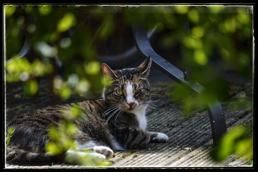 Het moment dat ze voor het eerst de tuin in mochten rende Loes naar buiten, stortte zich op de stoeptegels en ging daar liggen rollen alsof ze het vreselijk gemist had. Nicky daarentegen keek vanaf grote afstand, veilig binnen, toe en zodra hij een geluid hoorde dat té eng was vloog hij naar zolder. Het heeft weken geduurd voor hij een beetje de tuin in wilde, en dat was mede te danken aan de veilige aanwezigheid van zijn grote vriend MrB. Daarna begon het grote avontuur buiten de tuin, en zagen we onze bange kater veranderen in een zelfverzekerde kater. Hij was geen echte jager, ik heb meer dan eens een nog levende en ongehavende muis gered die tussen zijn voorpoten lag. Met sommige katten in de buurt werd hij bevriend, we noemden ze altijd grappend ‘de gangsters van de buurt’.