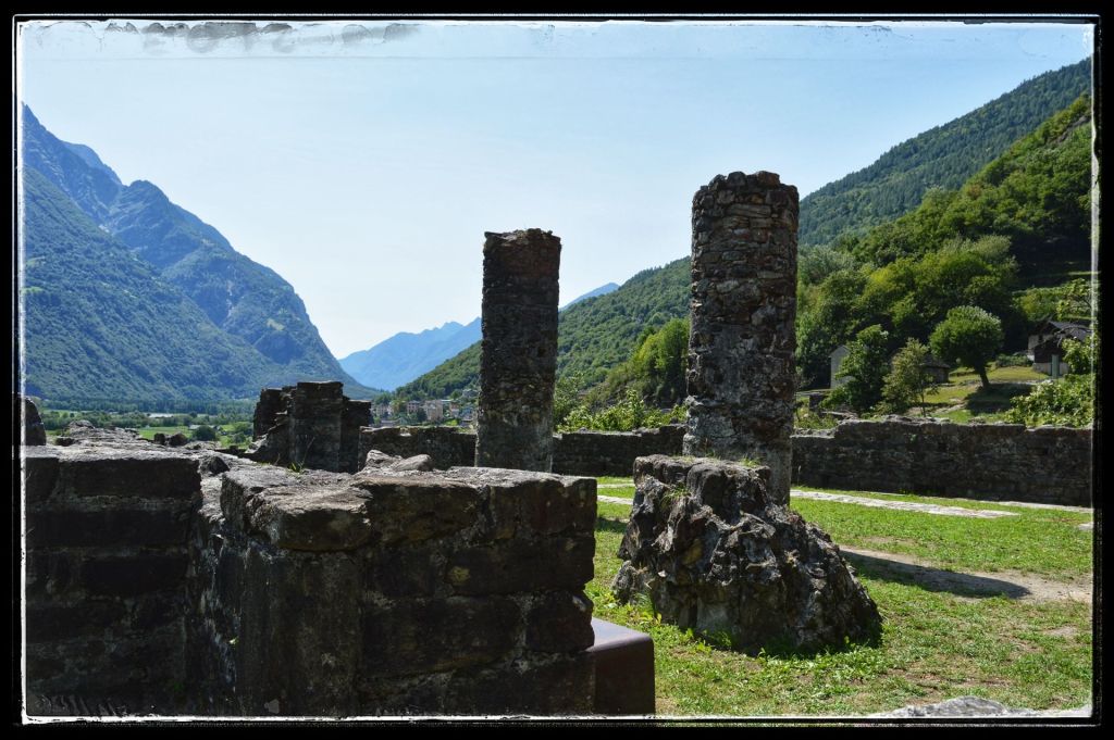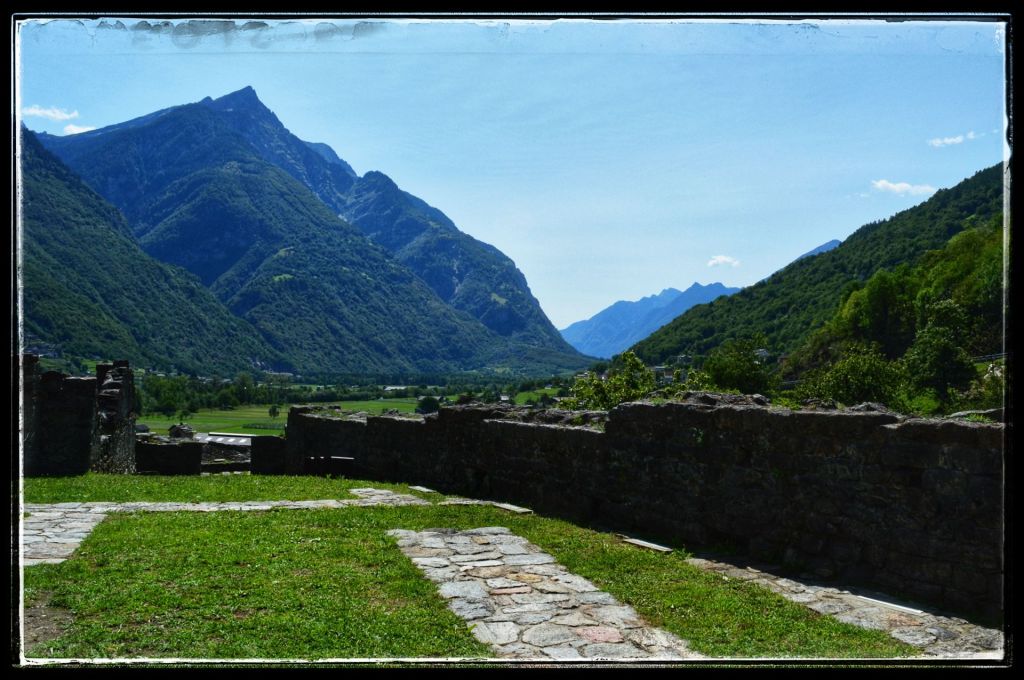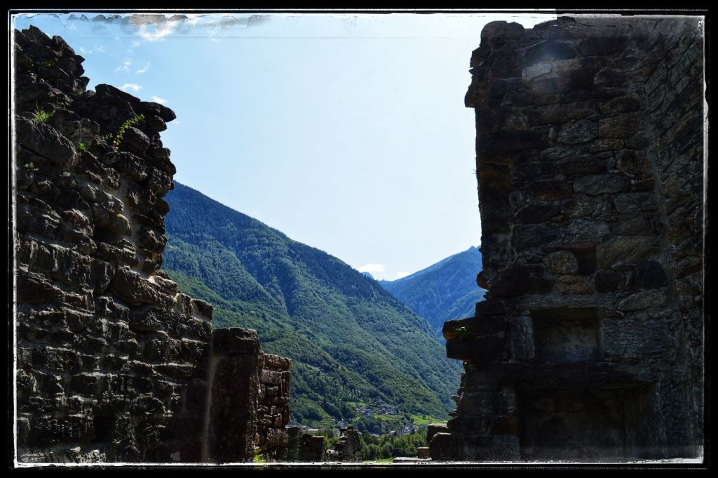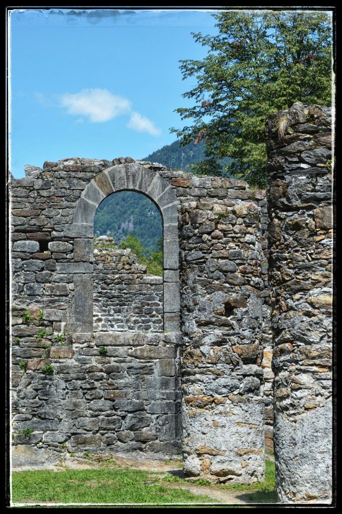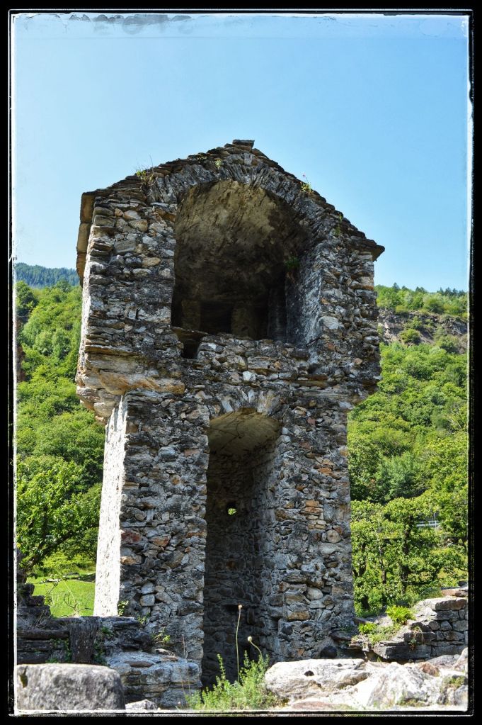 Sommige bezoeken lijken extra verankerd te zijn in mijn herinneringen, zoals deze ruïne. Mijn dochter en ik waren samen naar Zwitserland gereisd om mijn moeder op te halen die daar bij vrienden verbleef. Dan is het natuurlijk wel zo leuk om er gelijk een paar dagen aan vast te knopen en dus werd het een mini trip. Mijn moeder genoot overdag van de gastvrijheid van haar vrienden en dochterlief en ik gingen elke dag de schitterende omgeving van AquaRossa verkennen. ‘Dan moet je wel de ruïnes van Serravalle bekijken’ zei mijn moeder. We kregen een uitleg hoe er te komen, nadat we er vier keer langs gereden waren en niets snapten van de uitleg zagen we ineens dat de ruïne wat hoger lag, toch gevonden.