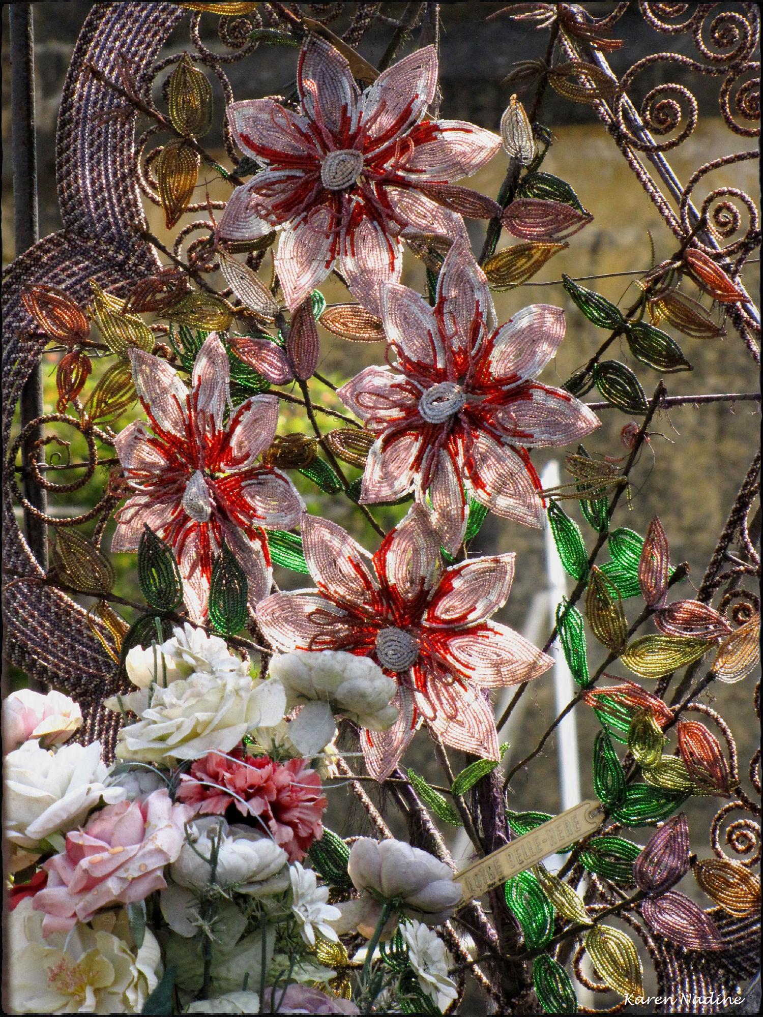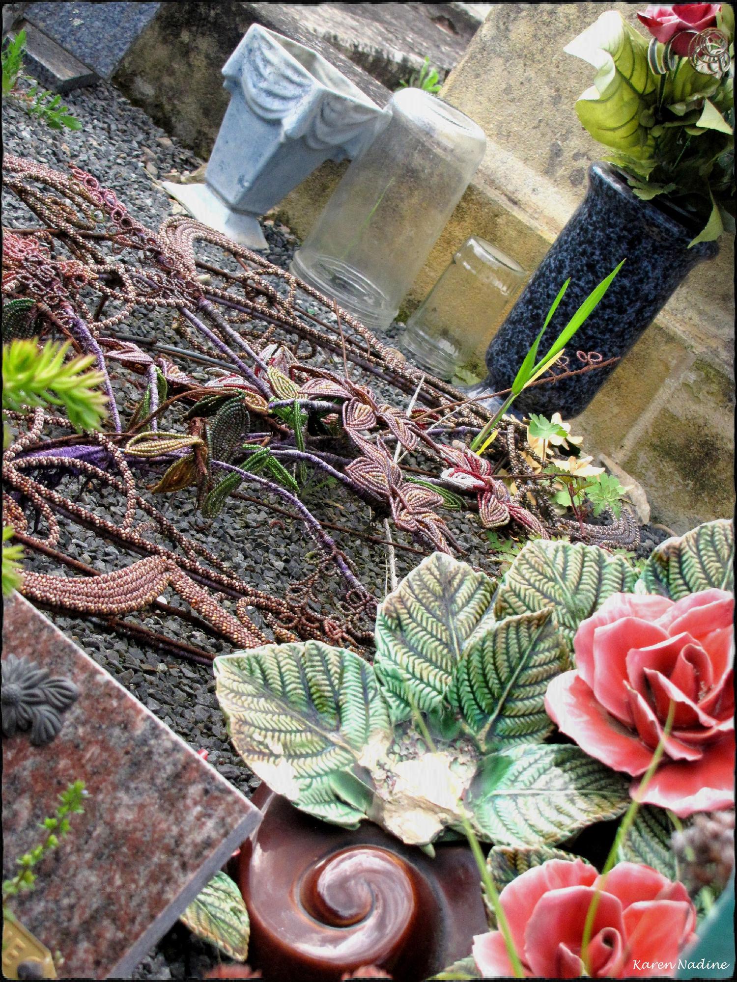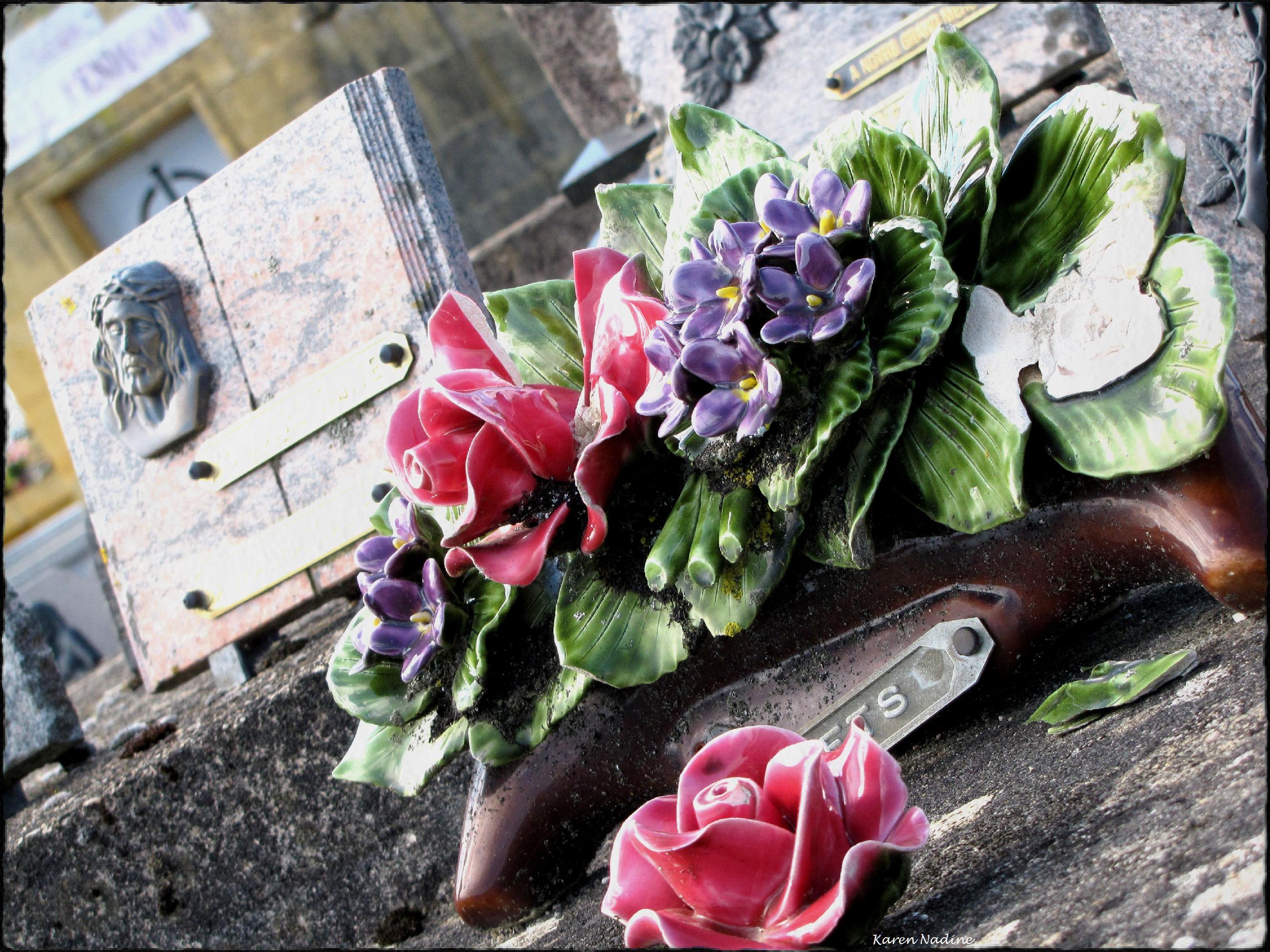 Op mijn computer had ik deze collectie opgeslagen als ‘Begraafplaats Meyrals’ in Frankrijk. Ik denk echter dat het de begraafplaats van Coulounieix-Chamiers is. Helaas is mijn Frans te slecht om informatie over deze begraafplaats op te zoeken. Opvallend vond ik, het was mijn eerste bezoek aan een Franse begraafplaats, de graven met ‘glazen tuinhuisjes’ eroverheen. Niet eerder had ik zoiets gezien. Ook vielen me enkele kunstzinnige bloemstukken gemaakt van ijzerdraad op, en uiteraard de vervallen oude graven.
